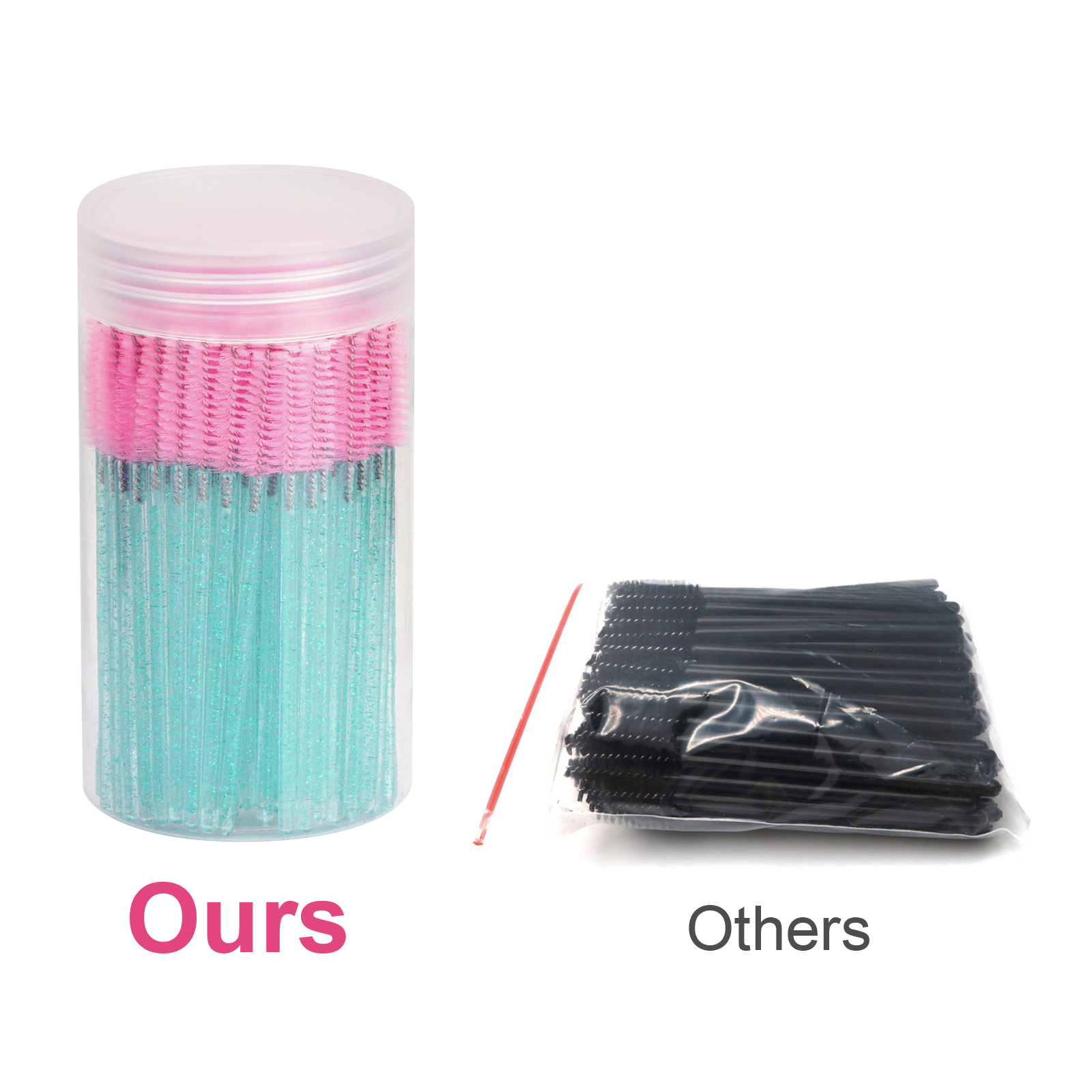 • Great assortment. Come with 100pcs mascara wands, enough to use for different purpose. The bristles are not black, so you can see they're dirty and when to throw away. Also help to see how much mascara is on the spoolie.